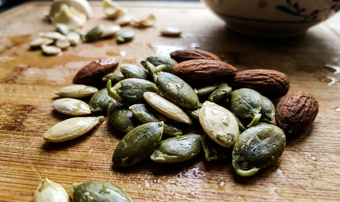 Tag en lille håndfuld rå græskarkerner eller rå mandler