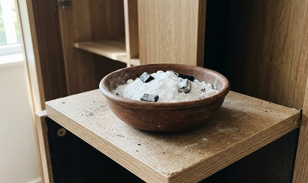Placer underkopper med bagepulver i hjørnerne af rummet og inde i skabene